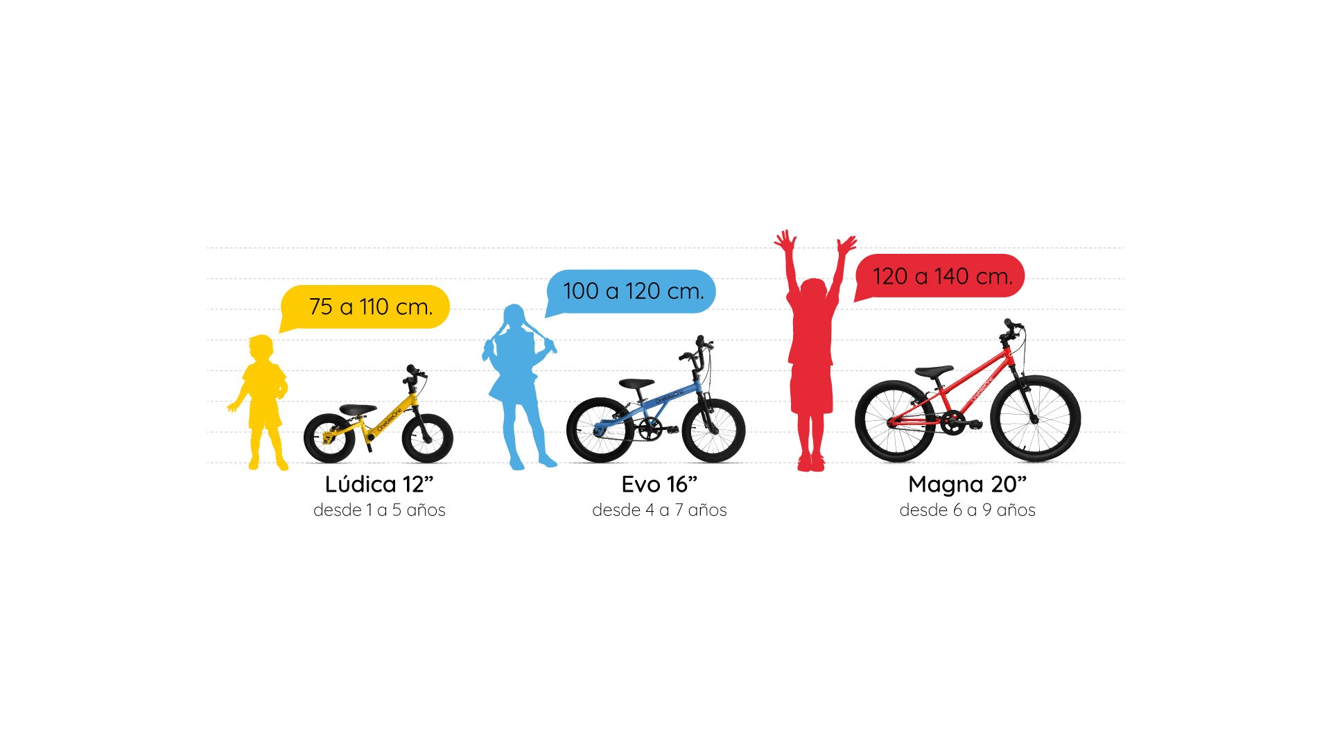 Para escoger la bicicleta adecuada ten en cuenta las siguientes medidas según la estatura y la edad.